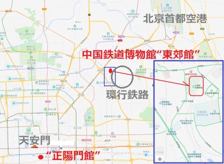 環行鉄路と中国鉄道博物館“東郊館”の位置、天安門の南の赤丸印は前回紹介した“正陽門館”