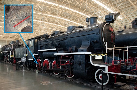 この機関車の第4動輪、写真中の矢印で示した車軸の端部には、「9659」と刻印されています。この機関車が元「9659號機」であったとすると、大正4年(1915年)川崎造船所(川崎重工業の前身)神戸工場で製造されたことになります。説明プレートによれば1992年南京西機関区に置かれていたものを当博物館のコレクションとしたとなっています。となると、1980年代の華東地区が最後の活躍場所だったようです。