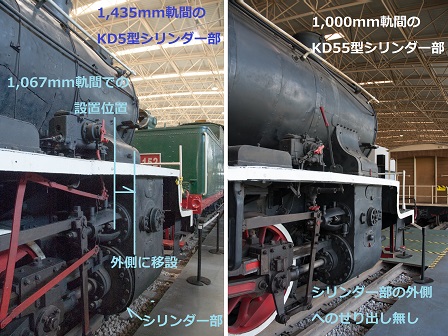 KD5型とKD55型の軌間の違いが判るように、比較写真を2枚掲載します。標準軌の車両はシリンダー部が外にせり出していて、また台枠と動輪の間の隙間が広くなっているのが写真からお分かりいただけると思います。