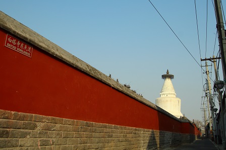 妙応寺の白塔はチベット仏教の様式によって建設されたもので、中国に現存する最古で、最大のラマ塔です。モンゴル人が中国を支配した元朝至元8年(1271年)、皇帝フビライは国名を大元に改め、大元皇帝の王座に就くとともに、この塔の建設を命じました。