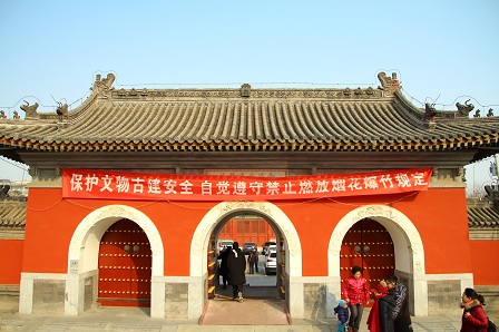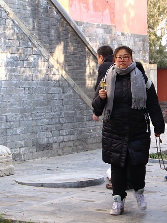 妙応寺では廟会(びょうかい)という春節の縁日のようなものはないため、沢山の人が押し寄せるということはありませんが、思ったよりも多くの人たちが来ています。人々は四ヵ所の仏殿を参拝したのち、白塔の周りを時計回りに何周も回ります。一人の女性は転経筒(てんけいとう)というチベット仏教徒がよく使う筒を右手に持ち、左手には数珠を握りながら回っています。回るということは、仏教の代表的な教えの一つで有る輪廻転生(りんねてんしょう)を表していると思います。