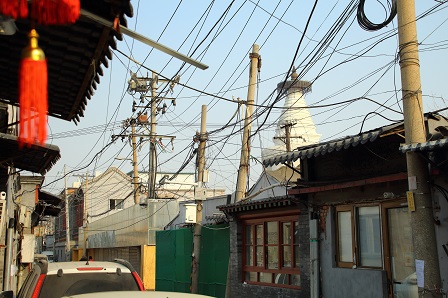 阜成門内大街は昔の城壁があった阜成門から西四までを結ぶ大通りです。大通りの南側は、高層ビルが林立し、話題となっているAIIB(アジアインフラ投資銀行)など数多くの金融機関が集中する金融街です。一方、反対の北側は胡同(フートン、「路地」の意)のなかに四合院作りの古い建物が並ぶ昔ながらのエリアです。