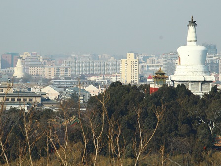 冒頭から妙応寺の白塔を紹介しましたが、上の写真は今回の主役である二つの白塔が一緒に映っているものです。右が北海白塔と呼ばれる北海公園にある白塔で、左が妙応寺の白塔です。この写真は、北京故宮博物院の真北にある景山(高さ43m)から撮ったものです。これだけでは分かりづらいかもしれませんが、景山から西をみてほぼ直線上に、北海白塔と妙応寺の白塔が並んでいます。