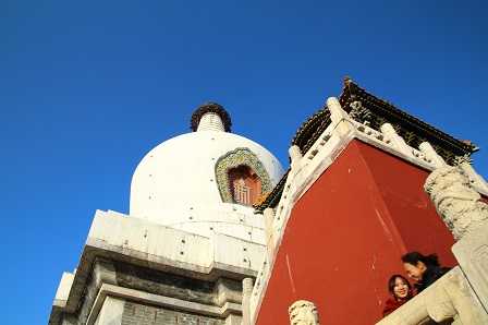 北京には万里の長城、故宮博物院、天壇、頤和園など世界遺産をはじめ数多くの名所旧跡があります。北京の人たちにとって、それらは誇れるものではありますが、世界的な名声があるがゆえに少しばかりよそよそしいものでもあります。それに反して、北海白塔は昔から変わらずに彼らの心の拠り所なのです。聞くところでは、文化大革命の際、猛威をふるった紅衛兵たちでさえ、北海白塔には指一本触れなかったそうです。それは、幼いときから四季を通じていつもその前で遊び、いつも自分を温かく見守ってくれる北海白塔が母親のような存在であったためです。今でも北海白塔の優しい眼差しに包まれながら多くの人たちがスケートを楽しんでいます。