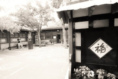 《老舎記念館内。右の福の字は、夫人胡絜青のもの。左側に老舎の銅像(2009年8月24日立)、奥が母屋、左側は息女の部屋。2本の木が見えるが、これは1953年老舎と夫人が植えた柿の木。》