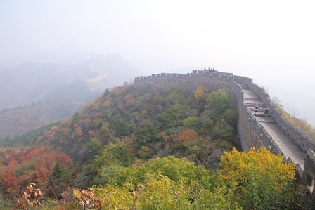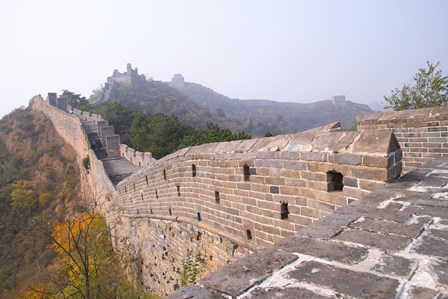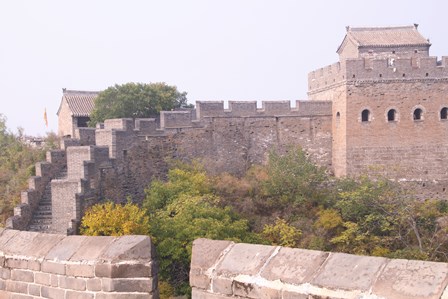 金山嶺長城は、北京市内から約130km、北京市と河北省との境にあります。ふもとには数軒のみやげ物屋と立派な入場ゲートがあります。ここから坂道を登り、金山嶺長城の正面玄関というべき広い広場と大きな城壁(中国語では「磚垜口」)に着き、長城は左右に連なっています。ここから左にコースを取り、将軍楼から沙嶺口までいろいろな傾斜の坂を上り下りして、ふもとまで下ると、ちょうど2時間、これが一般的なコースです。