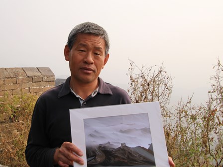 写真の右のしっかりした建物が将軍楼、左の旗が建っている小さな建物が軍事指揮所といいます。この小さな建物に農民写真家である周万萍氏がいます。彼は1965年金山嶺のふもとの村で農民の子として生まれ、9歳のときに、事故により右手と左足に大怪我を負いました。中学校を卒業して、金山嶺長城の修復作業に参加し、21歳のときに、初めて上海海鴎製の中古カメラを買い、観光客に写真撮影を行う商売を始めました。その後、独学で写真の勉強をしながら、彼にとっては小さい頃からの遊び場所であり、自らの大地とも言える長城の撮影を始めました。27歳のときに初めて写真コンクールに入賞し、その後、数々の賞に輝き、写真集を2冊出版、今では、大家ともいえるほどの人物になっています。