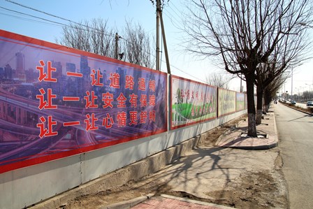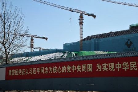 【建設現場に掲げられた“習近平同志を核心とする……”と書かれたスローガン。北京でよく見られるようになりました】