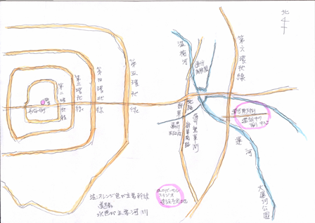 次は地図の右側を見て下さい。通州です。見て頂くと分かるとおり、通州は南北に流れる河川と東西に走る北京から続く幹線道路の交差する場所にあります。河川の西側(左側)が昔からの通州の市街地で、南北に走る道路が新華北路、新華南路といい、昔からのメインストリートです。