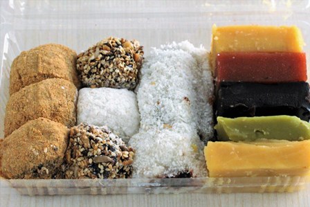 【甘味の詰め合わせ26元(約420円)。左から、“ロバがのた打ち回る”、第二列の上下二つは“ゴマとナッツがかかった紫の餅(中国名=紫米球)”、真ん中に一つあるのが“Ai Wo Wo(艾窩窩)”、第三列が“ヤシの実がかかった白い餅(中国名=椰茸巻)”、第四列が“中国風ういろう5種(味がそれぞれ違います。中国名=豌豆黄)”。このパックの詰め合わせは全て宮廷料理(満州料理)の流れを汲むものです】