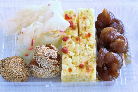 【甘味の詰め合わせ第二弾13元(約210円)。左上から、“Jiang Si Pai Cha(中国名=姜絲排叉。少し粘りのあるステックに生姜蜜をかけたもの。満州族や回族のお茶請けのひとつ”、 左下が“口を開けば笑っちゃう(中国語=開口笑。あまり甘くなくサクッとしています)”、第二列が“Sa Qi Ma(やわらかいおかき)”、第三列が“甘い耳たぶ(その形からこの名前に。回族料理の一つで、砂糖を小麦粉の中に大量に入れたドーナッツをぎゅっと固めたようなもので、とても甘い)”】