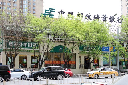 新緑が吹き出しています。牛街に入ったところにある郵便局です。ここにもイスラム教のシンボルカラーである緑色の上に、金色や白色のアラビア語が書かれています。