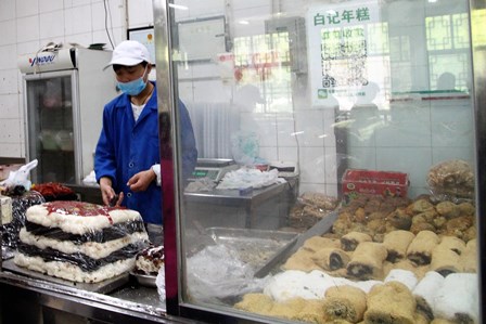 牛街スーパーの1階にある甘味販売処。イスラム教徒は飲酒が禁じられているため、お茶とお茶請けを大切にします。そのため、彼らのお茶請けは様々な種類があります。写真の真下が“切糕(qie gao)”というお餅と甘い餡を何層かに重ねたものです。右下が前回の「穀雨・2017年4月20日」で紹介しました甘味“ロバがのた打ち回る(馿打滾儿lű da ger)”。ここのロバは大きいです。