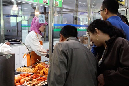 牛街スーパーの2階は食堂になっています。まず、この食堂専用のプリペイドカードを買い(金額は自由)、左側に見えるとおり、牛街独特のお店が数店舗出ていますので、好きな店で好きな食べ物を購入します。余ったプリペイドカードはいつでも返金してくれます。写真では分かりづらいかもしれませんが、一番左側の牛肉面の店は閉まっていました。他にも1、2店閉まっています。北京では景気が回復しつつあると言われていますが、まだ本調子とまではいかないようです。
