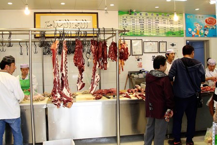 輸入胡同には数件の肉屋があり、写真はそのうちの一軒です。どの肉屋も、牛肉や羊肉をそのまま吊るして売っています。日本ではあまり見られない光景ですが、この街ではこれが普通なのです。北京でも一般のスーパーでは肉をパックにして売っています。しかし、庶民は、パックの肉は冷凍もので新鮮でなく、一方、この吊るし売りは新鮮で、更に安いと言っています。