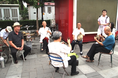 まず、来ましたのは、什刹海の南端、“前海”の入り口です。ここは、地安門大街という大きな道路に沿っているため、人通りが大変多いところです。ここで、京劇をやっている一団に出会いました。左の帽子を被ったおじさんが唄い、京胡、大小のドラなどで演奏し、結構人を集めています。演奏中も、演者がそれぞれおしゃべりしたり、タバコを吸ったりと、自由気ままなもので、皆楽しそうに弾いたり、叩いたりしています。