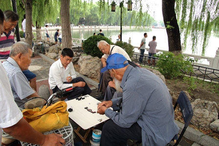 “前海”の東側を回り、金錠橋を渡ったところで、老人たちが“牌九(pai jiu)”というゲームで遊んでいます。これは、掌に入るほどの細長い黒い板に白や赤の丸印が彫られた牌を使って4人で遊ぶゲームですが、ルールはよく分かりません。ひげ老人の手前には、1厘硬貨(0.01元=約0.16円)が数枚置かれています。しかし、数厘といえども、真剣な顔で勝負しており、いつも数名のギャラリーがたむろしています。