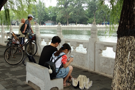 金錠橋から銀錠橋を横目に見ながら、“後海”に入りました。この辺は木々も多く、汗が出てきた身体を休めるのにちょうどよい所々にベンチが置かれています。そんなベンチの一つに若いカップルが座っています。日本でも中国でも同じなのでしょうが、今どきの若い人は、デートのときも、話をしないで、ずっと携帯をいじっています。