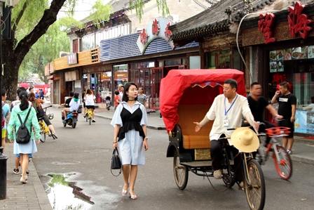 銀錠橋を渡り、先ほどの“後海”の対岸にやってきました。ここら辺は、先ほど紹介しました生演奏があるバーが数軒集まっているストリートの一つで、人通りの多いところです。赤いほろが付いた客を乗せる自転車は、什刹海の“胡同周遊”で大活躍しています。ここで、偶然、車夫が一人歩きの若い女性を誘ったところを写真に収めることが出来ました。この後の結果は?皆さん、お分かりと思いますが、期待にそぐわず、すげなく断られました。