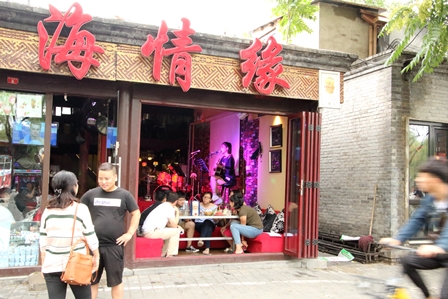 ここも、さきほどの“後海”の「酒吧街(jiu ba jie)」にある生演奏を聞かせる一軒のバーです。窓を広々と開けて、生演奏を聞かせ、客を誘っています。
