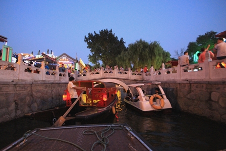 日が暮れてきました。“後海”の波止場から観光船に乗りました。船は人力ですので、ゆっくり“後海”を回り、銀錠橋をくぐって“前海”に向かいます。銀錠橋は、有名な写真撮影の定番スポットです。