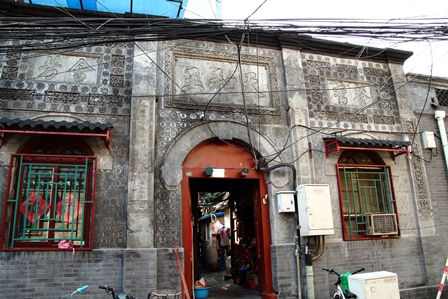 「石頭胡同」にある黒く汚れてはいますが、外壁に様々な紋様が施されている建物です。この胡同には石頭(いしあたま)のおじいさんが住んでいたわけではありませんで、中国語では“石”のことを“石頭(shi tou)”というのです。そのため、「石頭胡同」は日本語では“石ころ路地”といったところです。