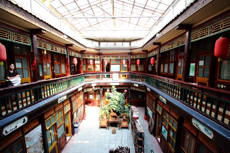 北京には、「四合院」作りという正方形なり長方形の敷地に、平屋の建物を南北東西の四辺に配し、真ん中を空間(庭)とする建築様式があります。故宮や前回紹介した恭王府など、北京の代表的な建物のほとんどがこの様式で、北京人が一番好むものです。この建物も「四合院」様式の発展形態で、四周全てに部屋を配し、二階の手すりは遊郭らしく湾曲を入れて粋な空間を演出しています。