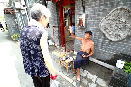 胡同を歩いていて、インコを飼う84歳のおじいさんに出会いました。日がな一日、家の前に座り、脇の小さなテーブルに白酒の入った急須とおかずを置き、ちびりちびりやるのが日課だそうです。我々のような物好きがインコをネタに話しかけると、「待ってました」とばかり、話を始め、今度は話が止まらなくなります。我々が話をしていると通りがかりのおばさんも自然に会話の中に入ってきました。中国人の人懐こい(ひとなつこい)ところです。