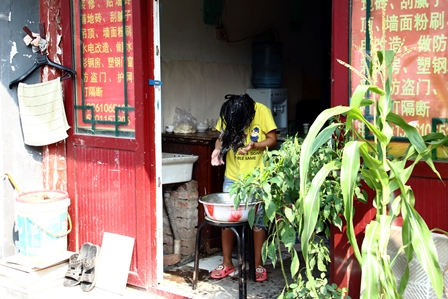 女の子が家の前で髪を洗う姿を見かけました。この写真をご覧になって、北京はまだこのような状況かと、誤解されるといけませんので、ひと言説明します。現在、中国は経済発展を遂げ、北京でも地方都市でも、高層マンションが数多く建ち並び、その中の部屋は立派で、全て風呂付です。そのため、このような店先でホーローのたらいを持ち出して髪を洗う光景は、昔はよく見かけたものですが、今では、滅多に見られない貴重なものとなりました。100年前には歓楽街として時代の最先端をいっていたところが、その遺構があるがゆえに取り残されるという日本の下町と同じような現象が、北京のど真ん中で生まれているのです。