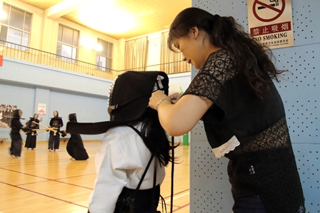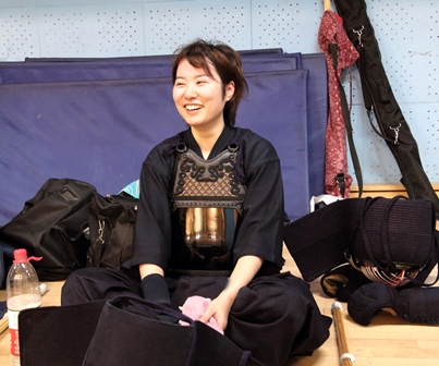 練習の中休みに話を聞いた中級クラスの女性です。彼女も、さきほどのへっぴり腰の眼鏡のおじさんと同じく、剣道を始めて半年だそうです。中国は日本よりも実力主義がはっきりしていて、強ければ、どんどん先に進むようです。剣道を始めたきっかけを聞きましたら、