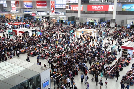【人で溢れている上海虹橋駅。中国では発車時間直前までプラットフォームに降りれないため、多くの人が改札口の前で待っています】
