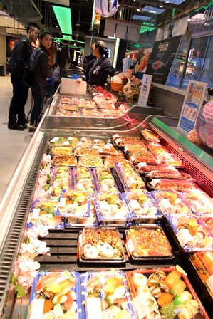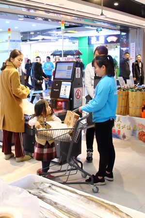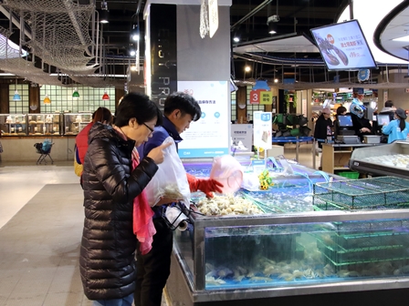 目指すスーパーはこのビルの地下1階にあります。入って直ぐが海鮮売り場ですが、魚の嫌な臭いは全くありません。開業して約半年とのことですが、店内はとても清潔です。店の面積は約1万㎡、日本の大型スーパーと同じような面積です。顔を上げると、レーンが天井に付くように張り巡らされています。ネットで注文があると、店員が備え付けの袋に商品を入れて、レーンに掛けます。商品は天井のレーンを通って、配送専門の場所で梱包され、電動自転車に乗った配達員によって客の家まで届けられます。この店では、半径3㎞以内であれば、注文してから30分以内に配達するのを売りの一つにしてしています。