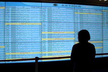 北京中医医院の1階ロビーの左側には、大きな電光掲示板が置かれています。この掲示板には、針灸科、泌尿器科、神経科など80に及ぶ診療科目ごとに、医師の名前、ランク、専門分野、出勤日と時間、そして登録費が表示されています。診療科目のなかには「男科」というのもありました。切実な人が多いのかもしれませんし、けっこう効くのかもしれません。