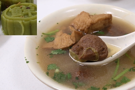 【緑豆の団子スープ3.560円、レンゲに載っているのが緑豆の団子)。左上が緑豆の菓子2元(約34円)