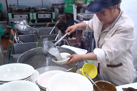 大きな桶から豆汁を掬う服務員