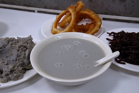 【写真中央が豆汁2元(約34円)、その上が焦圏(豆汁と一緒に食べる小麦粉を揚げたもの)1.5元(約26円)、右がつけもの(焦圏と同じく豆汁の付け合せ)1元(約17円)、左が麻豆腐(豆汁の搾りかすを炒めたもの、おからの緑豆版)16元(約270円)
