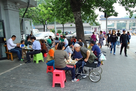 【店外の食事風景、後ろに見えるのが天壇公園の北門】