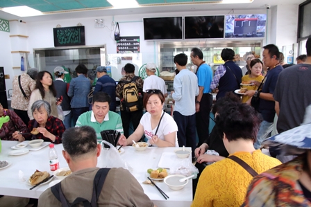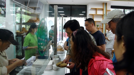 店内は30坪ほどの広さで、座って食事をする人、席の空くのを待っている人、食券を買ったり、注文した品を交換する人などで、ごった返しています。座りきれない人たちは、店外の青空の下で、プラスチックの簡単な椅子に座り、小さなテーブルに顔を合わせながら食事をしています。ときおり、高級車が停まり、ラフな格好をしたおじさんやおばさんが生の豆汁をテイクアウトしていきます。隣に座った上品そうなおばあさんに話を聞くと、ここには毎週23回は来て、豆汁を飲むのを楽しみにしているそうです。