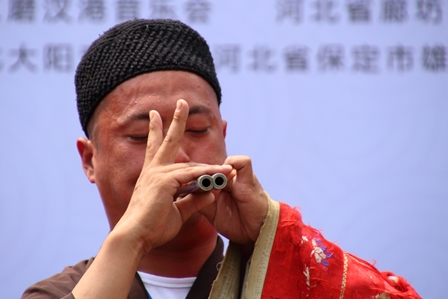※双管(ソウカン)=通常は1本の小さな管に、表に7つ、裏に2つの穴を開け、手で押さえて違った音階を出す「管子(カンシ)」と呼ばれる管楽器が使われるが、通州区の彼らは、それを二つ合わせたものを使う。1本でも普通の人では吹いても音を出せないそうだが、2本合わせると更に難しくなる。