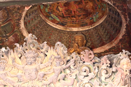 【轉輪蔵の上に安置された仏像と藻井】