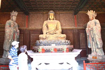 【如来殿に置かれている釈迦如来像(中央)、大梵天(向かって右)、帝釈天(同左)。元来、天井には黄金の藻井があったが、いまは何もない】