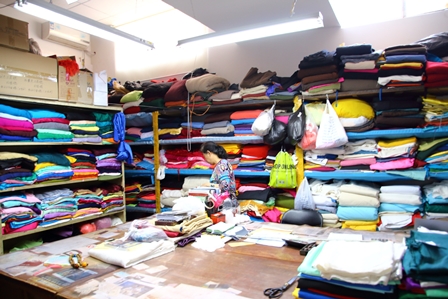 最初に案内されたのは、生地が沢山積まれている倉庫のようなところです。3~4名の従業員がいましたが、カメラを構えると慌てて立ち去ろうとしたため、こちらも慌ててシャッターを押しました。