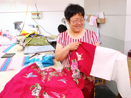 こちらは縫製部門の偉いおばさんです。先ほどの裁断のおじさんとのやりとりを聞いていたのでしょう、彼女は写真を撮られても堂々としています。さすが女性の主任さん、肝が据わっています。おばさんが手にしているのは、京劇の衣装で、牡丹や蝶の模様はミシン縫い、その周りは金糸で縁取りされています。
