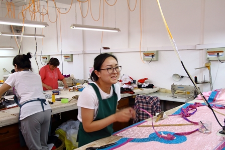 こちらの従業員はある程度できた製品にアイロンを当てたり、小さな生地を縫い合わせたりしています。真剣な姿を撮っていましたら、彼女は気付いて、今度は引きつっていない自然な笑顔を見せてくれました。