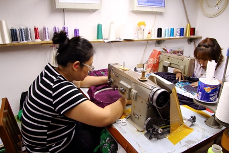 別の部屋ではミシンをかけています。かけているのは4人で、そのうちの2人が上の写真の方です。ミシンは嬉しいことに日本製で、一人は耳栓をして、奥の一人は風邪を引いたといって、かた鼻にティッシュを詰めています。若い女性の鼻ティッシュを撮っては失礼と思い、別のミシンの女性を中心に写真を撮りましたが、帰りがけふと気付くと鼻ティッシュは彼女の顔から無くなっていました。