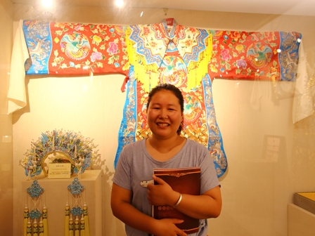 今回は、写真の張さんに案内していただきました。80元が効いたのか、とても親切に説明してもらいました。彼女の後ろにあるのは、おんなおろちという京劇の女性役の衣装です。この衣装は梅蘭芳という中国で有名な女形が創設した流派が使ったものの複製品です。また、写真の左にある鳳冠は京劇のなかで皇后など高貴な方が被るもので、翠鳥の羽という大変に貴重な素材を使っているとのことです。