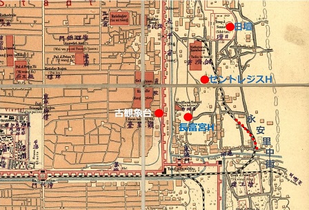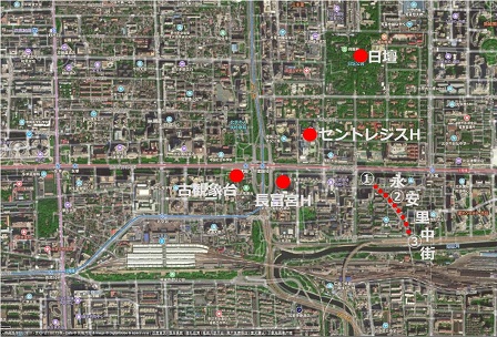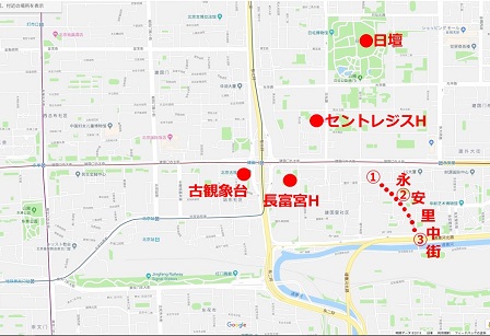 先ずは、永安里中街と長富宮飯店、さらに付近の主要地点として、古觀象臺(古観象台)、セントレジスホテル、日壇をプロットした地図をご覧ください。