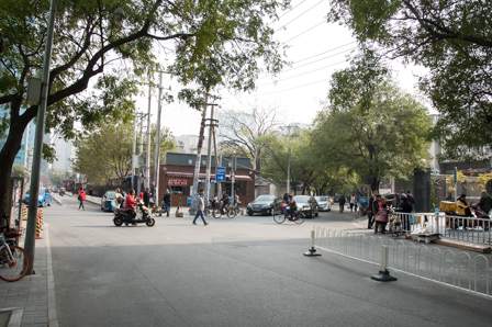 先ず、の地点ですが、ここは永安里中街の北の端となります。この写真の手前から左手奥に伸びる道が東西に走る永安里北街で、永安里中街は写真中央の交差点から斜めに右手奥に向かっています。