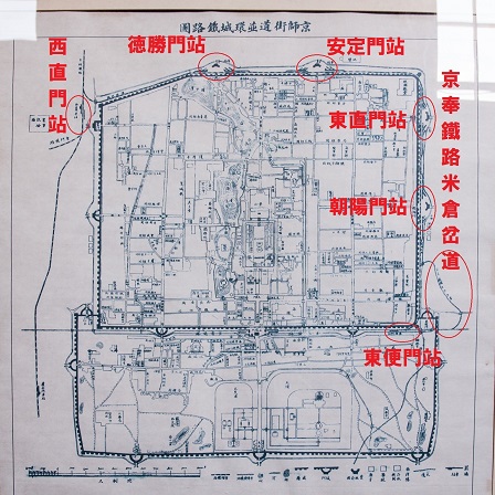 朝陽門站、東直門站を経て、西に転じて安定門站、徳勝門站を経て西直門站の北側で京張鐵路に合流するルートでした。これは、現在の東二環路と北二環路というか、地下鉄2号線の東側と北側のルートにあたります。
