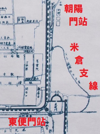 “京師街道並環城鐵路圖”をよく見ると、城壁の東、地図では右側にループ状の鉄道路線が描かれています。赤い楕円で囲んだ部分です。この部分には、“京奉鐵路米倉岔道”と記されています。米倉岔道とは、米穀倉庫支線(米倉支線)といった意味だと思われます。下の写真は、米倉支線部の拡大図です。
